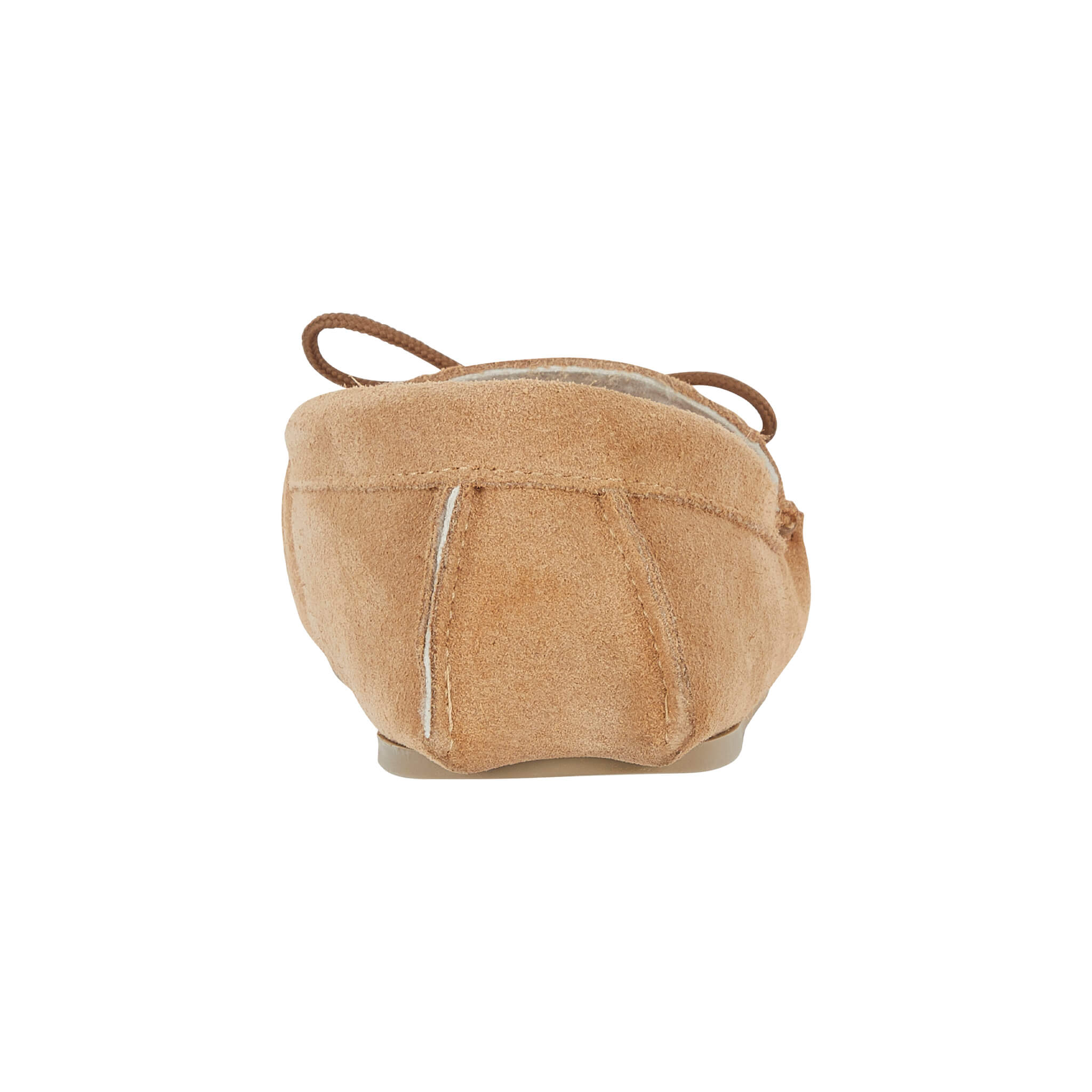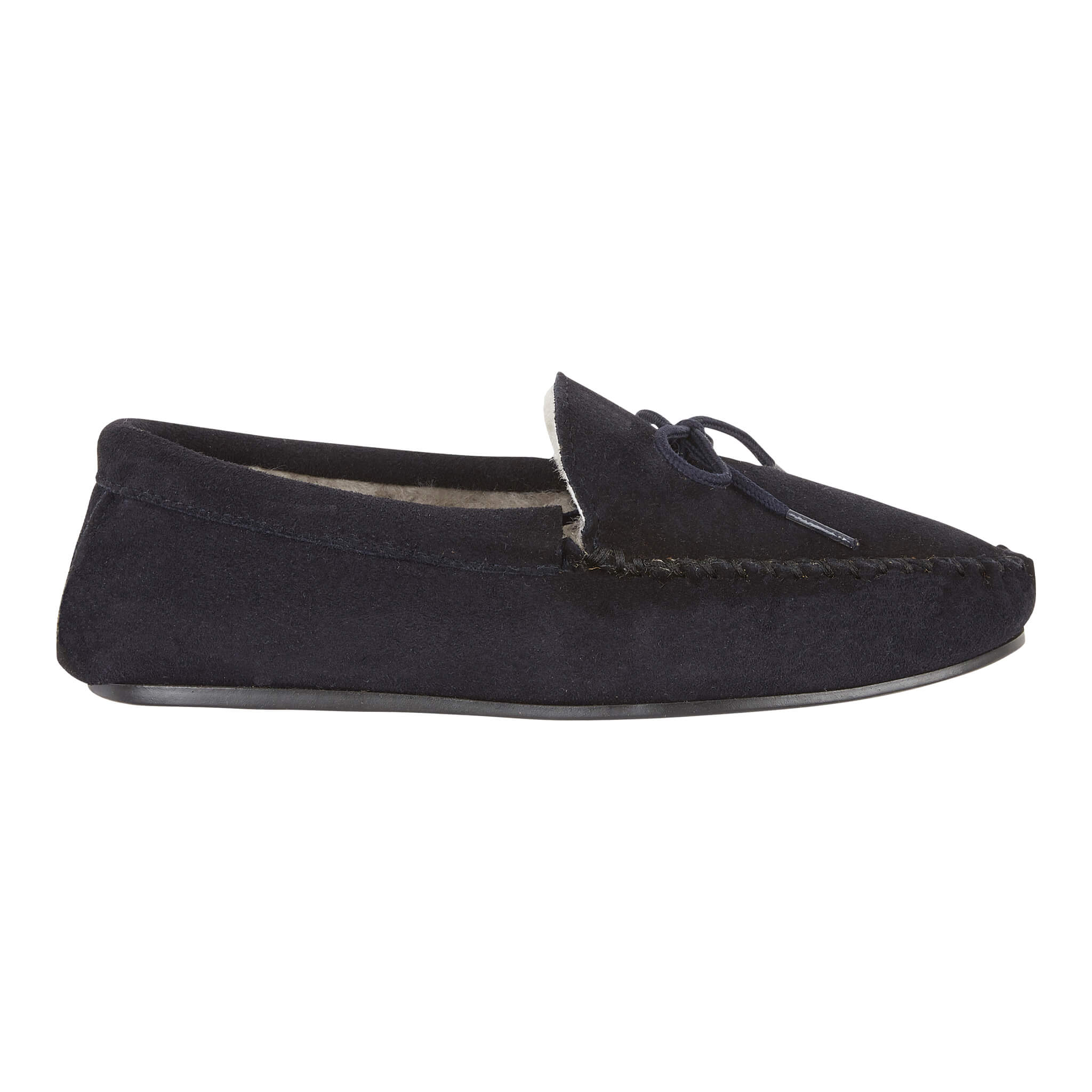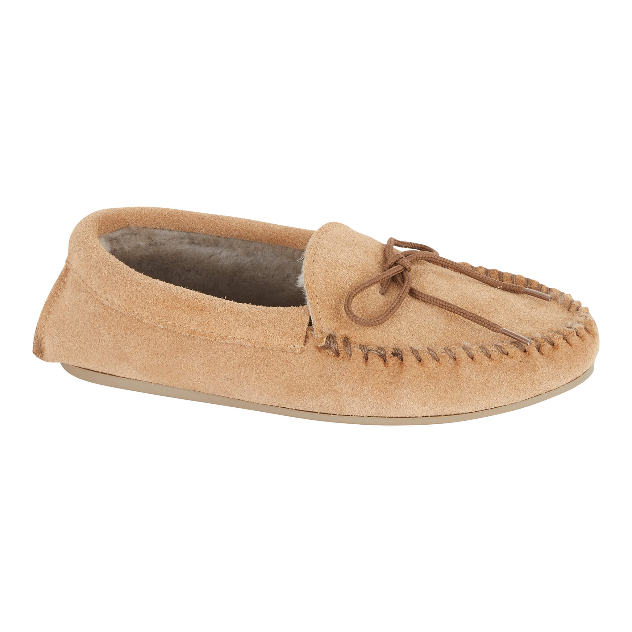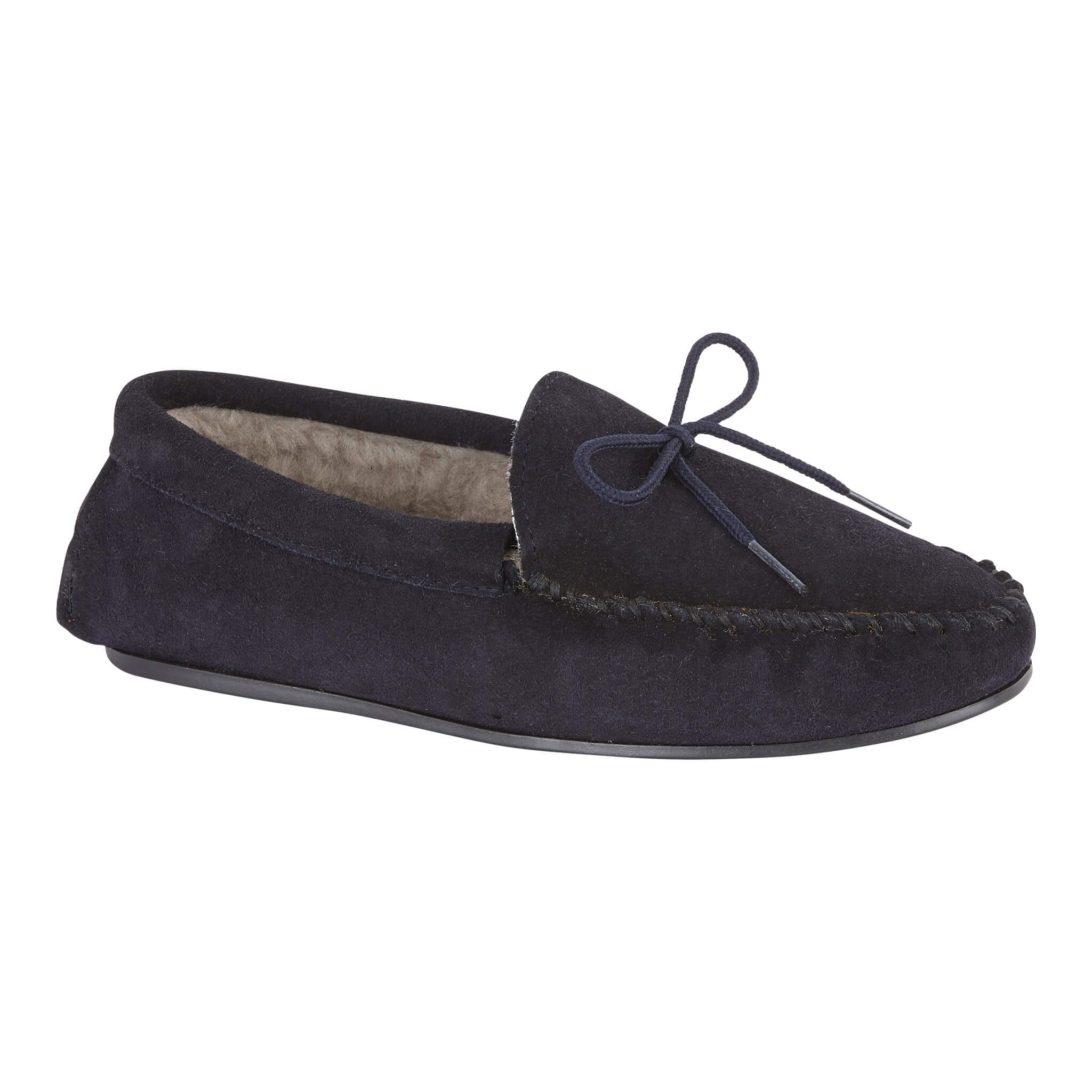 Our ladies sheepskin moccasin slipper. Made with a suede upper, our signature real sheepskin lining and a very flexible rubber sole for indoor and outdoor use. Made in England.