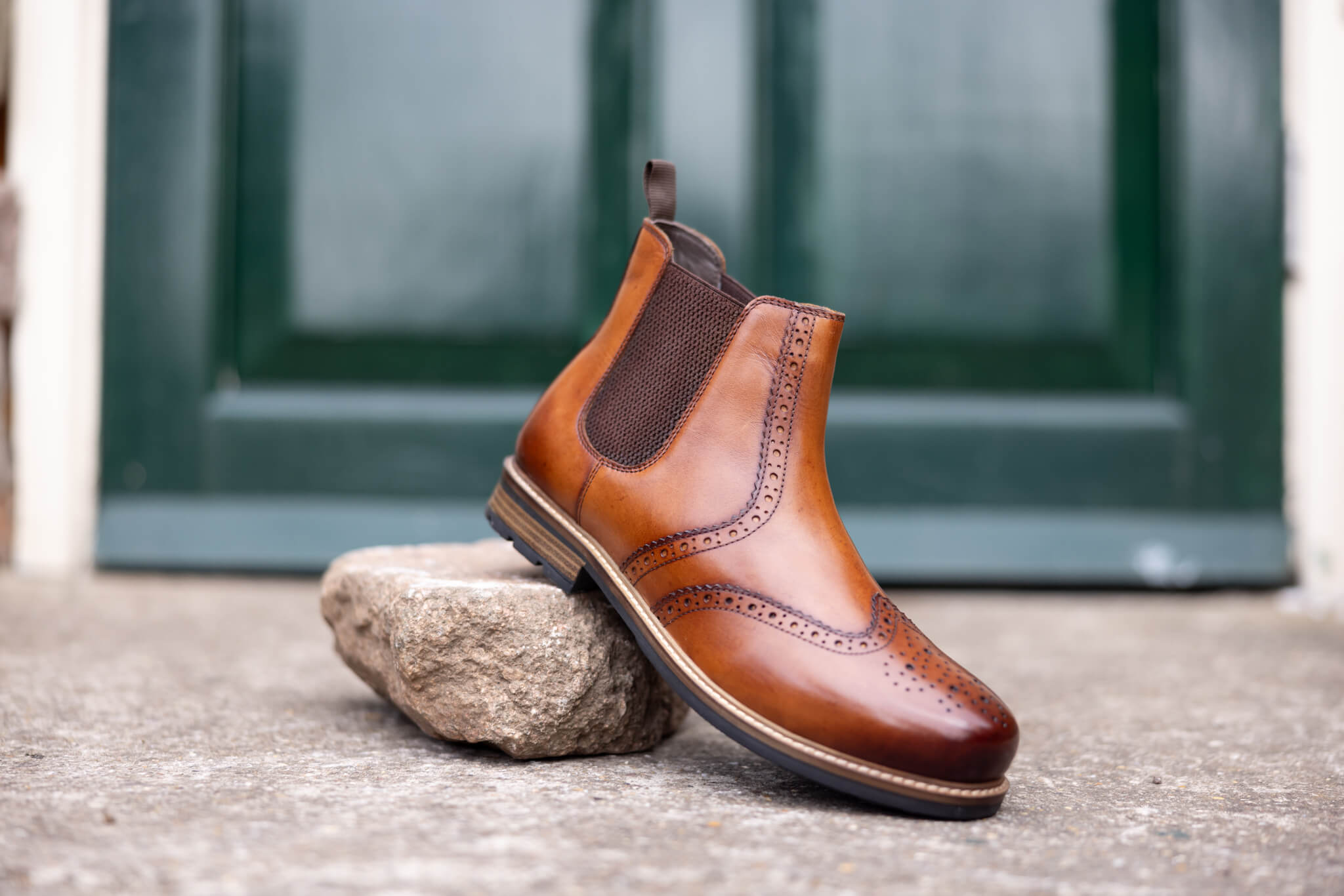 Our NEW men's sheepskin lined Chelsea boot. With a traditional brogue leather upper, real sheepskin lining throughout, including the insole, and a hard wearing non slip rubber sole. A high grade men's boot which is a true investment for winters to come.