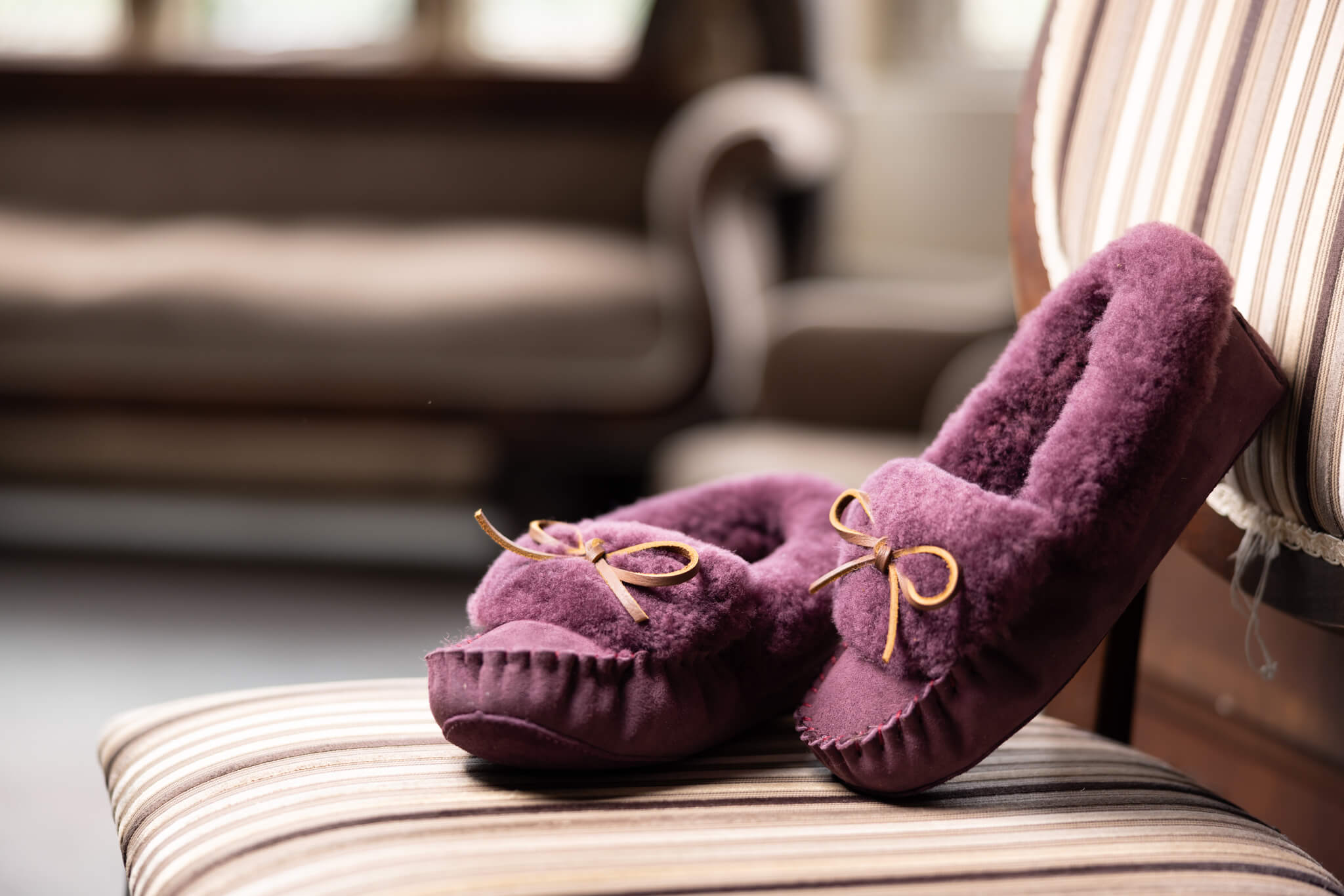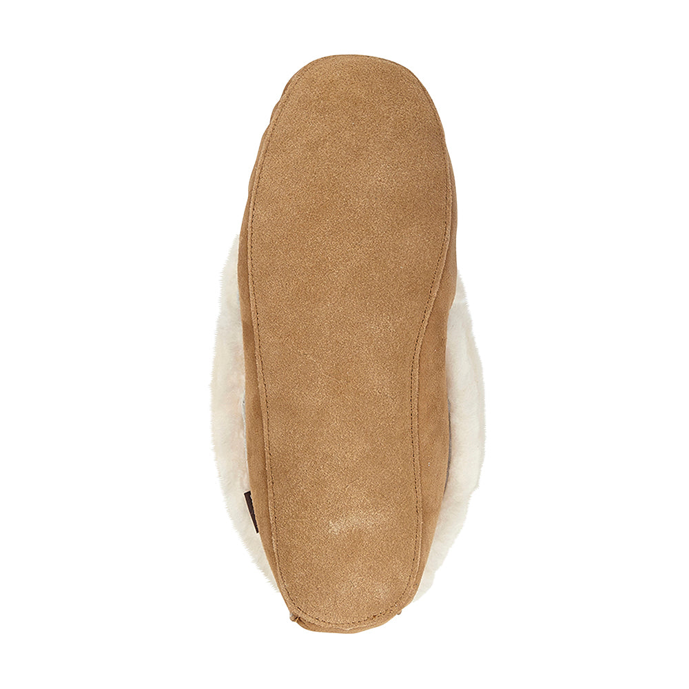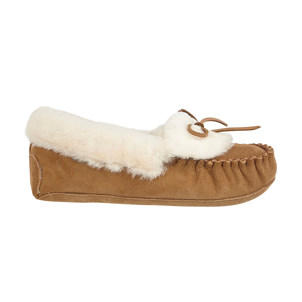 A flexible moccasin slipper for women made with double-faced sheepskin upper and collar, and a suede sole.